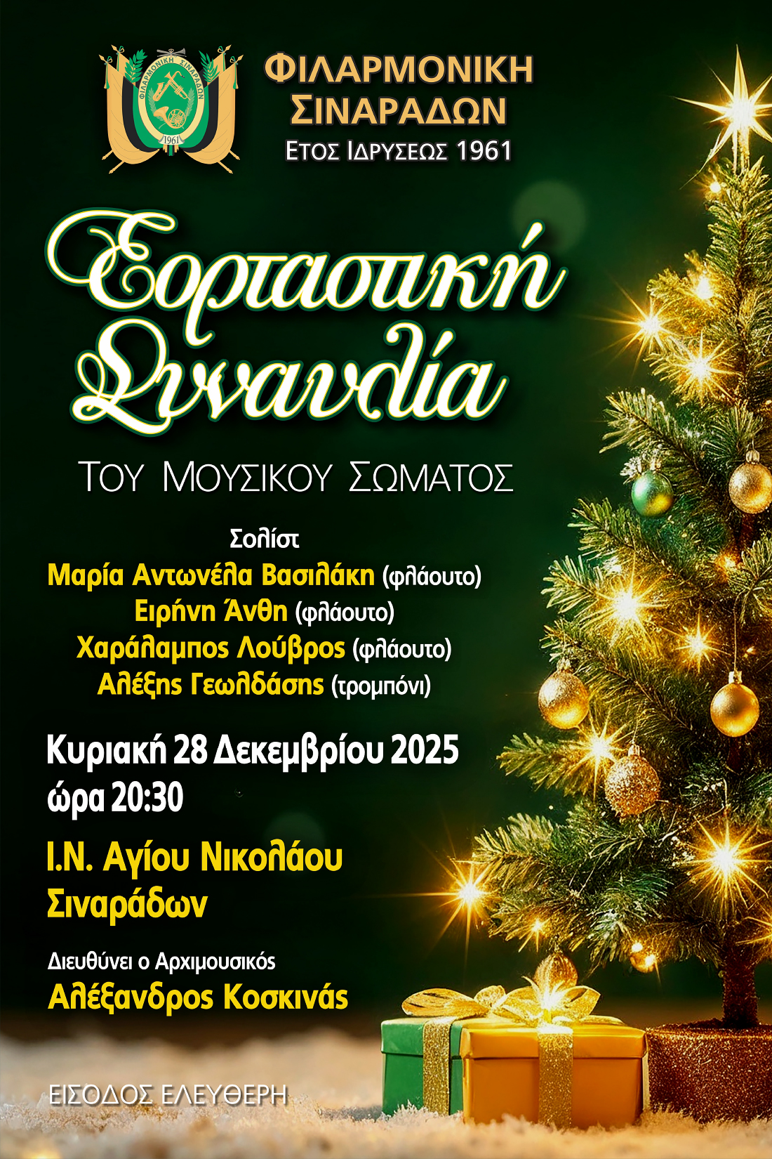 H  Φιλαρμονική Σιναράδων θα πραγματοποιήσει την καθιερωμένη Χριστουγεννιάτικη Συναυλία του Μουσικού Σώματος την Κυριακή 28 Δεκεμβρίου 2025 στις 20:30 στον Ιερό Ναό Αγίου Νικολάου Σιναράδων.